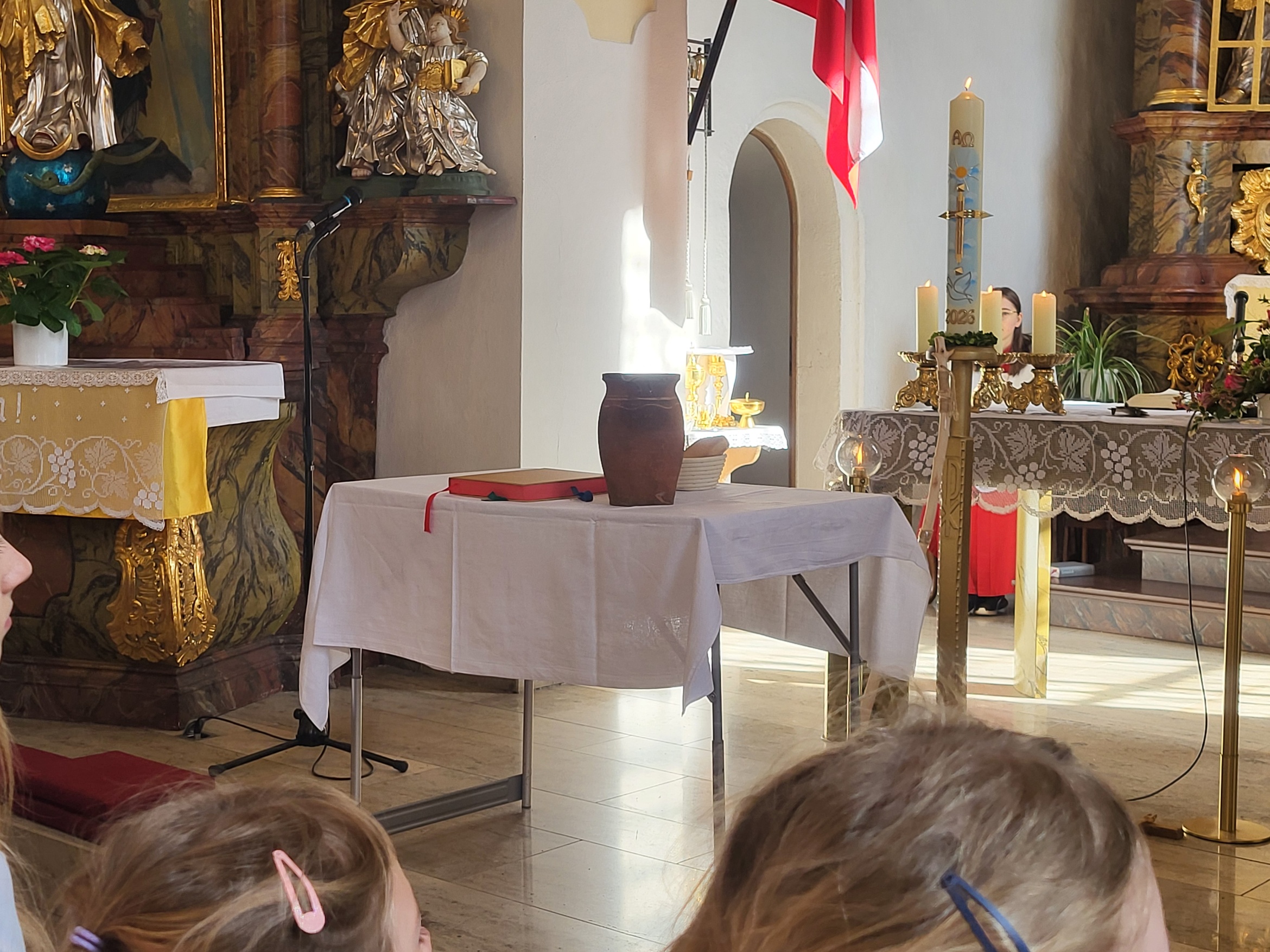 Gut gestärkt führte der Weg weiter in die Kirche. Dort eröffnete eine große Schar an Kindern gemeinsam mit den Ministranten und Pfarrer Bertram Ziegler den Gottesdienst. Für die musikalische Gestaltung sorgte die Gruppe „feingestimmt“, die die Feier stimmungsvoll begleitete.