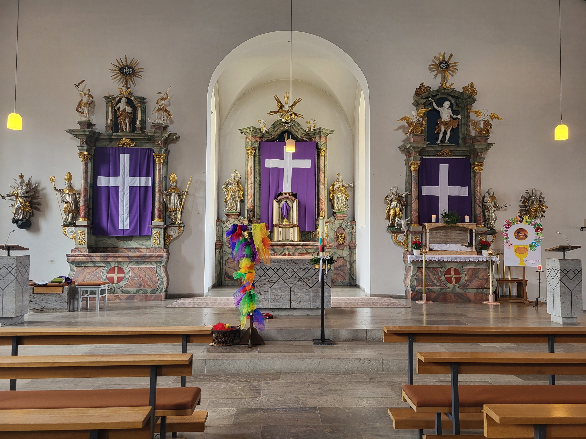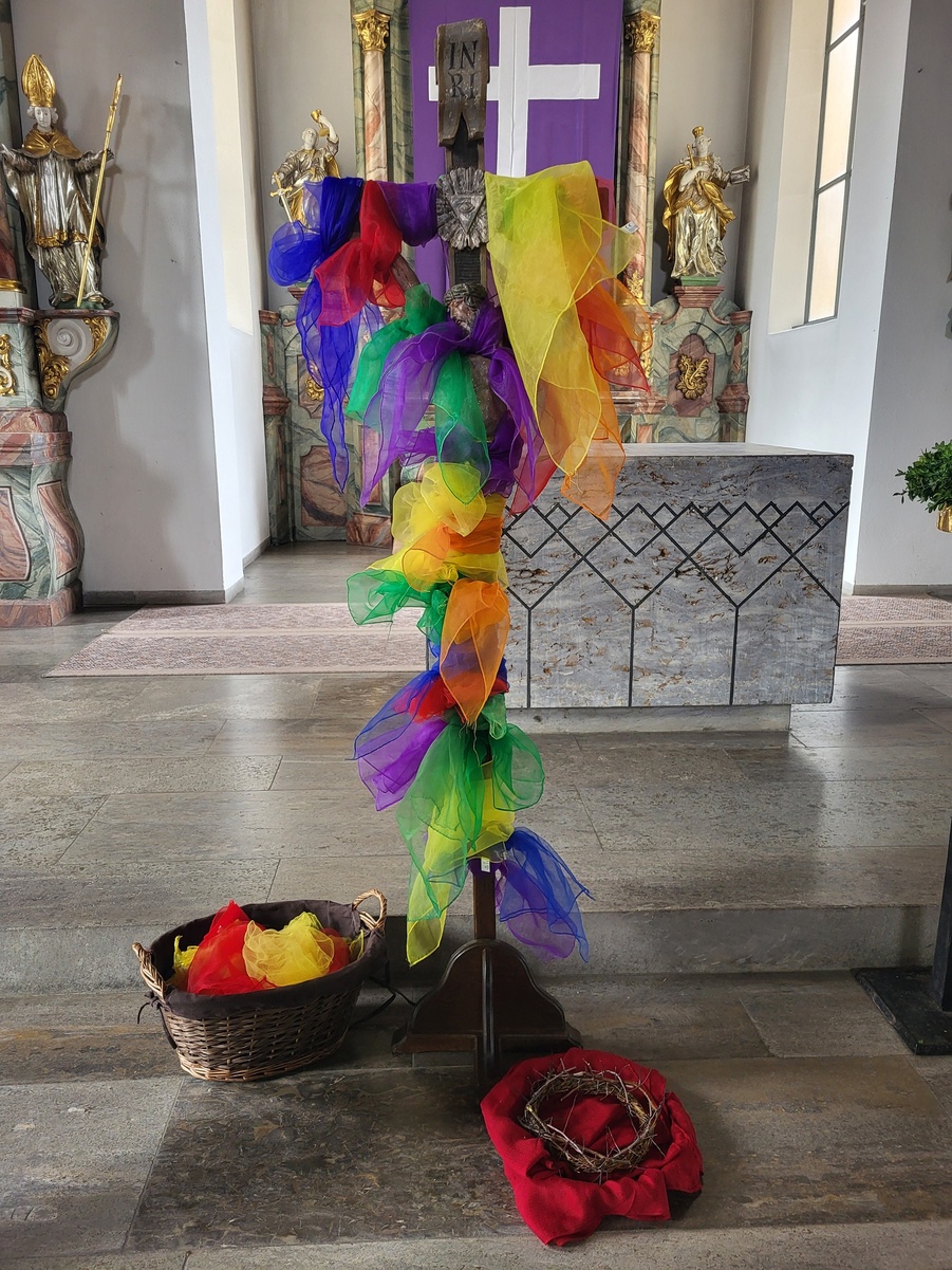Während der Kreuzverehrung schmückten die Kinder das Kreuz mit bunten Tüchern. Farbe kehrte zurück in den Raum. Licht. Leben.