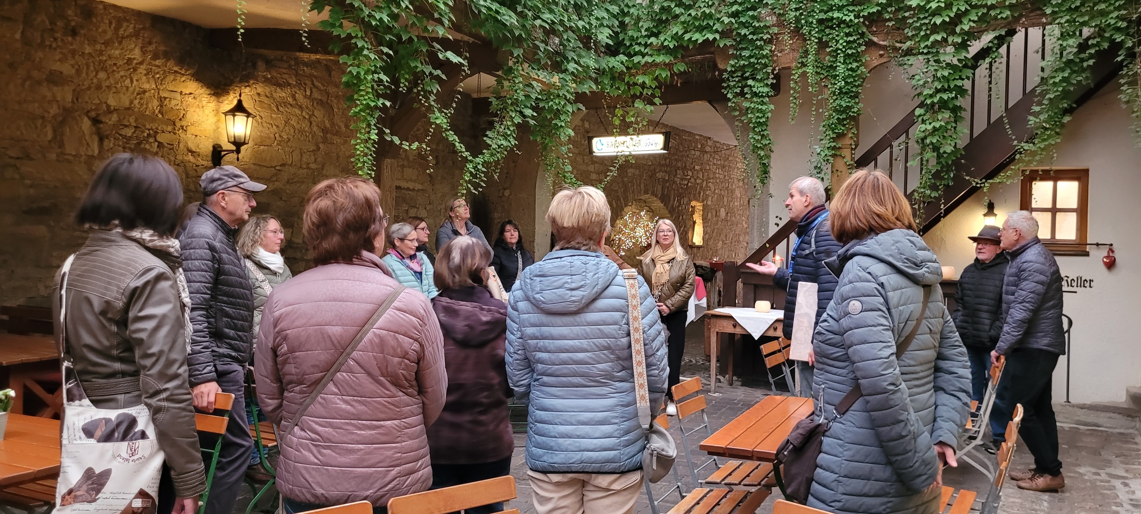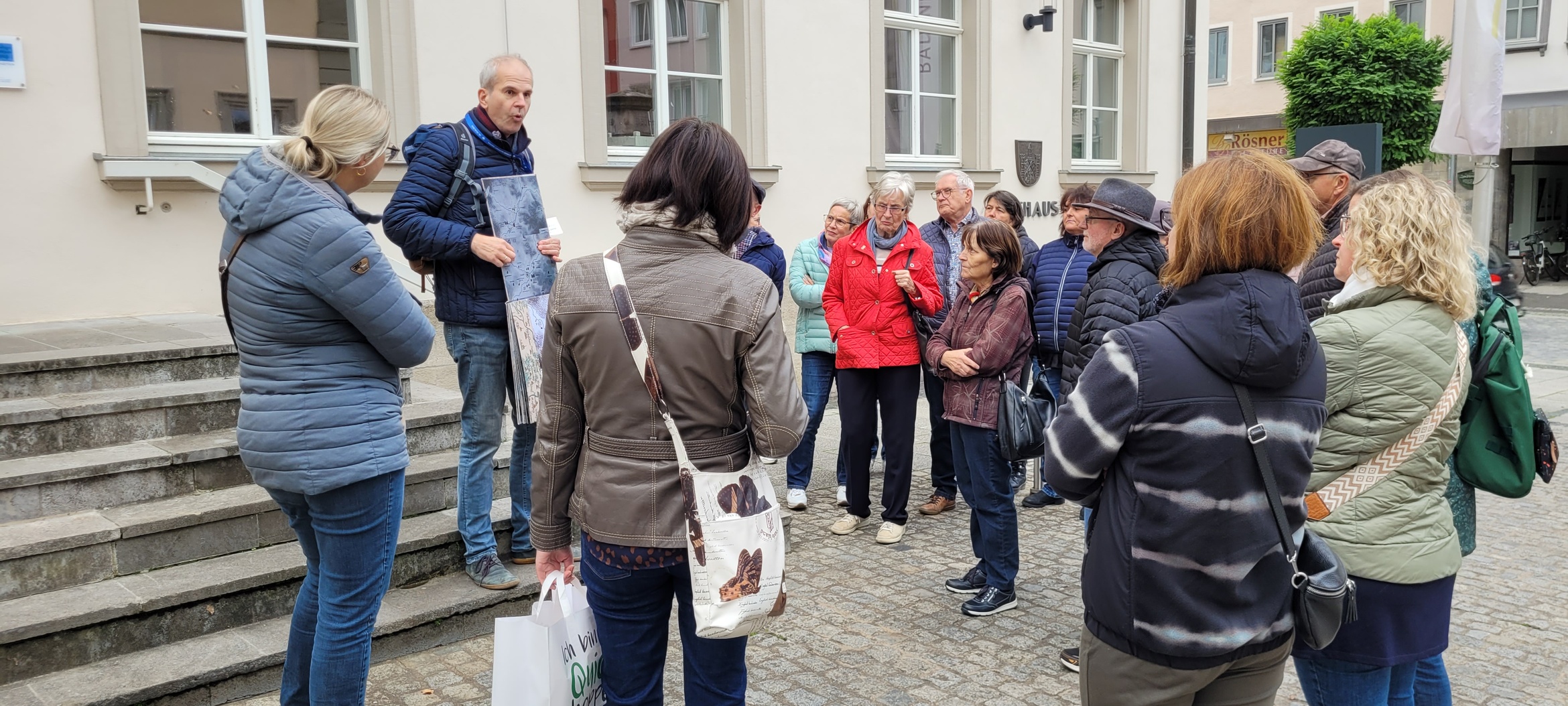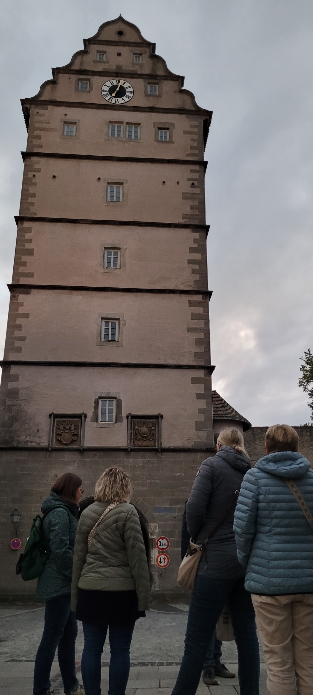In zwei Gruppen wurden sie von zwei Stadtführern an zentrale Stellen der Innenstadt geführt und erfuhren dabei in kurzweiligen Erzählungen Wissenswertes und Amüsantes rund um Geschichte und Kultur der Kreisstadt. So wurden sie ausgehend vom Rathausvorplatz an die Stelle des früheren Spörleintors geführt, besichtigten die Karmelitenkirche und die Stadtpfarrkirche und erklommen das Hohntor mit wunderbaren Aussichten auf die Stadt bei Nacht. Im Anschluss kehrten alle beim Italiener ein und verbrachten miteinander einen schönen Abend.