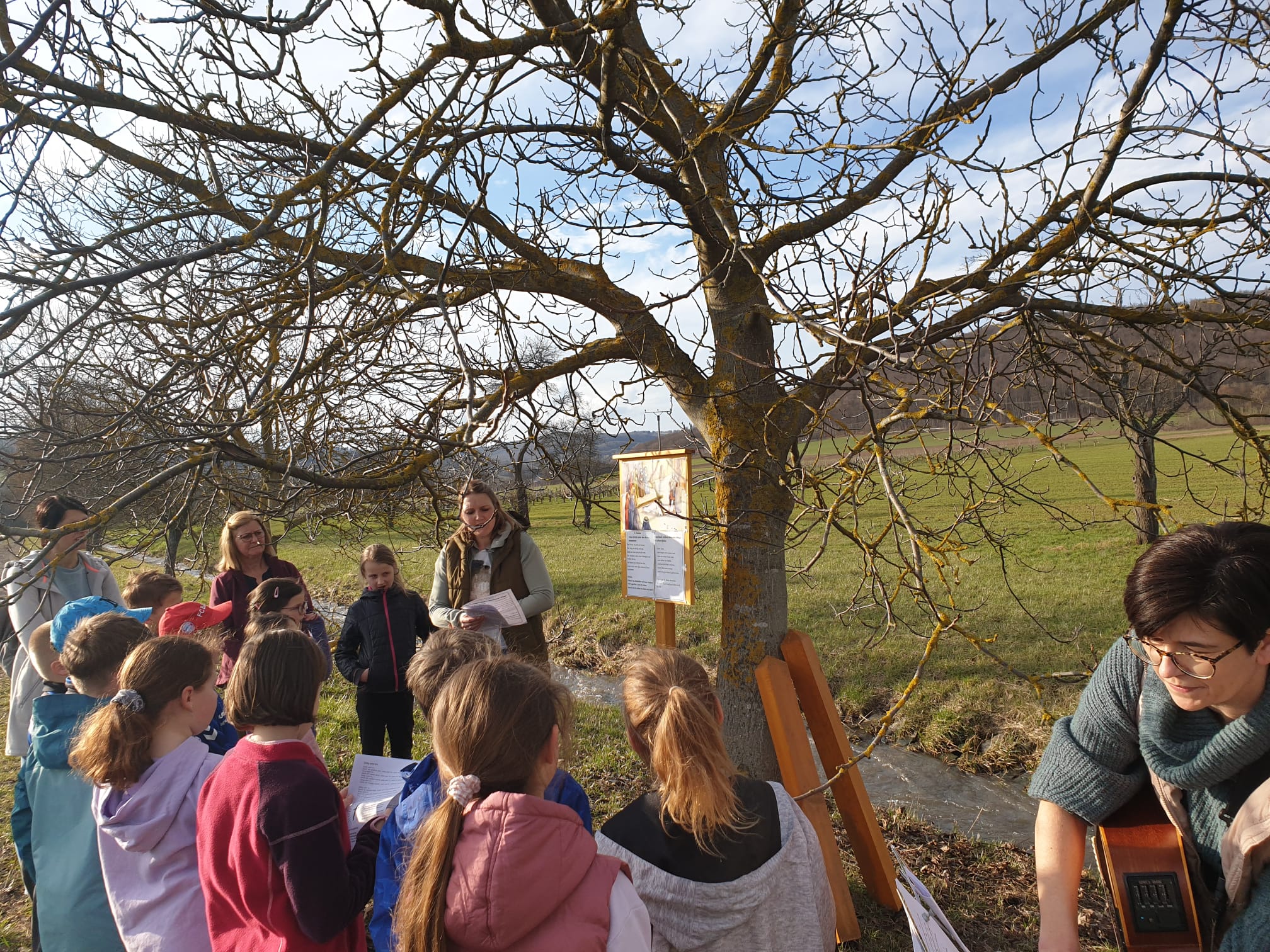 Während der Auftaktveranstaltung (die Stationen mit allen Materialien bleiben bis 14. April stehen) erlebten die Teilnehmer so die besondere Atmosphäre und spürten das Leiden, Sterben und die Auferstehung Jesu durch zahlreiche Impulse nach. Gemeindereferentin Evi Warnke leitete die Aktion und fand stets die passenden Worte zum Nachdenken. Die Kinder konnten den Eindrücken aus den Bildern, Texten und Gebeten durch unterschiedliche Aktivitäten jeweils einen besonderen Ausdruck verleihen. So wurden beispielsweise Menschenketten ausgeschnitten, eine Dornenkrone gestaltet, Kreuze gebunden, Tränen dargebracht und natürlich zum großen Halleluja eine Sonne mit gelben Strahlen bestückt. Viele neue geistliche Lieder bildeten dazu einen meditativen Rahmen.