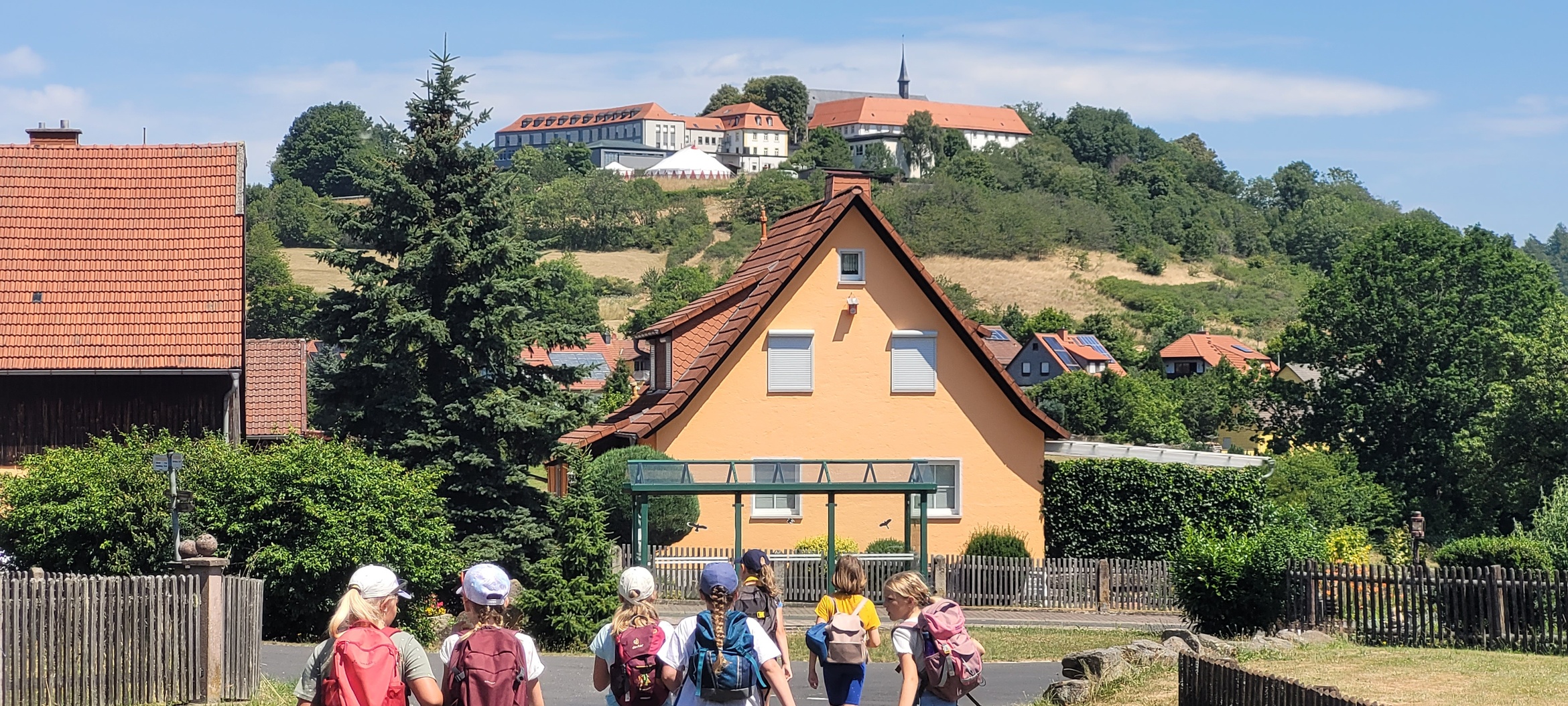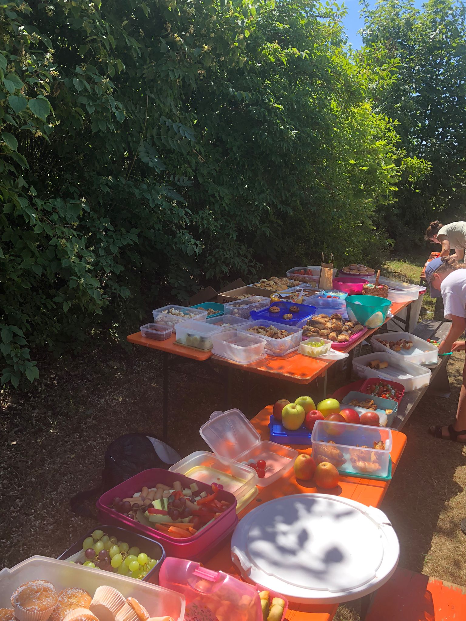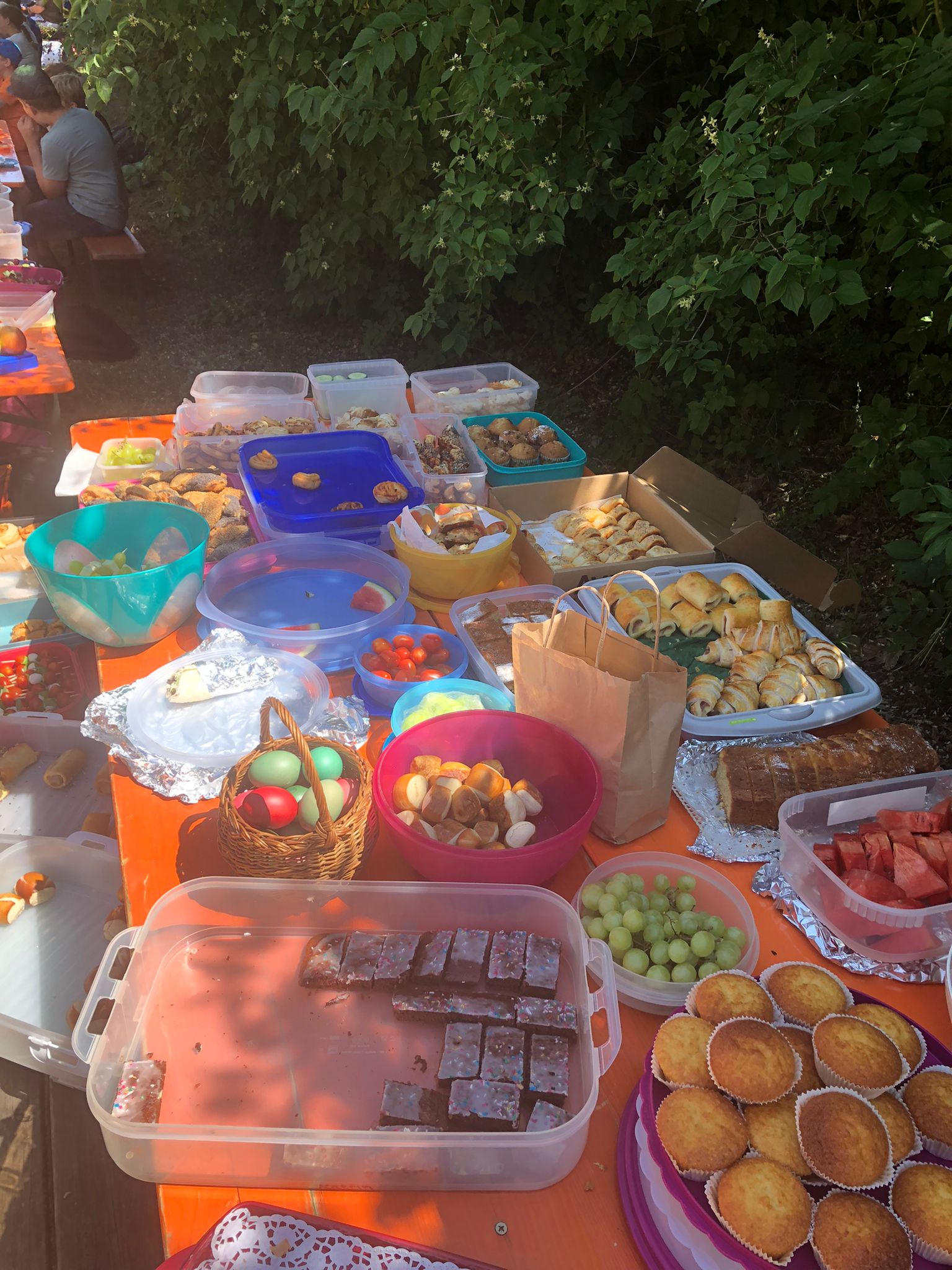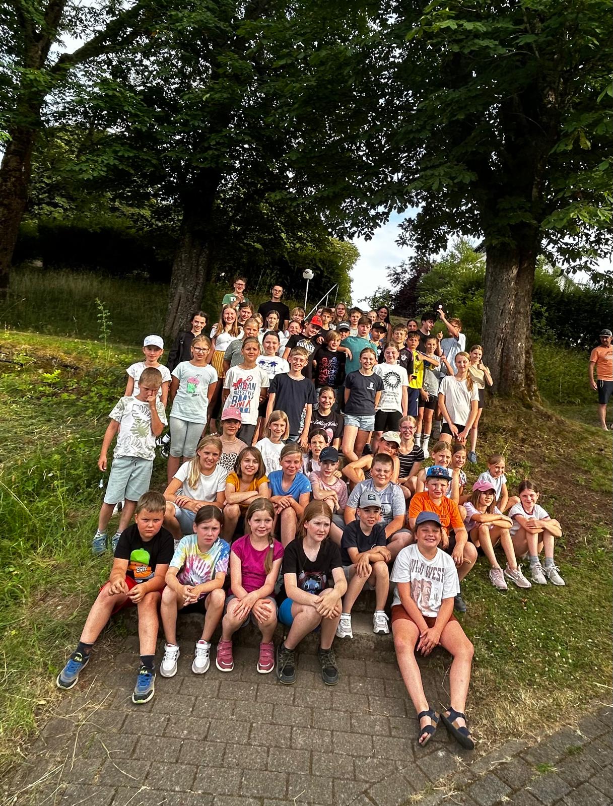Die Wanderung führte hoch zur Jugendbildungsstätte Volkersberg, wo die anderen sie am Grillplatz erwarteten. Ein gemeinsames Mitbringbuffet mit einer riesigen Auswahl sorgte für das leibliche Wohl und lud zu einer entspannten Siesta ein. Die Vielfalt der Speisen spiegelte die Gemeinschaft und den Zusammenhalt der Gemeinden wider.