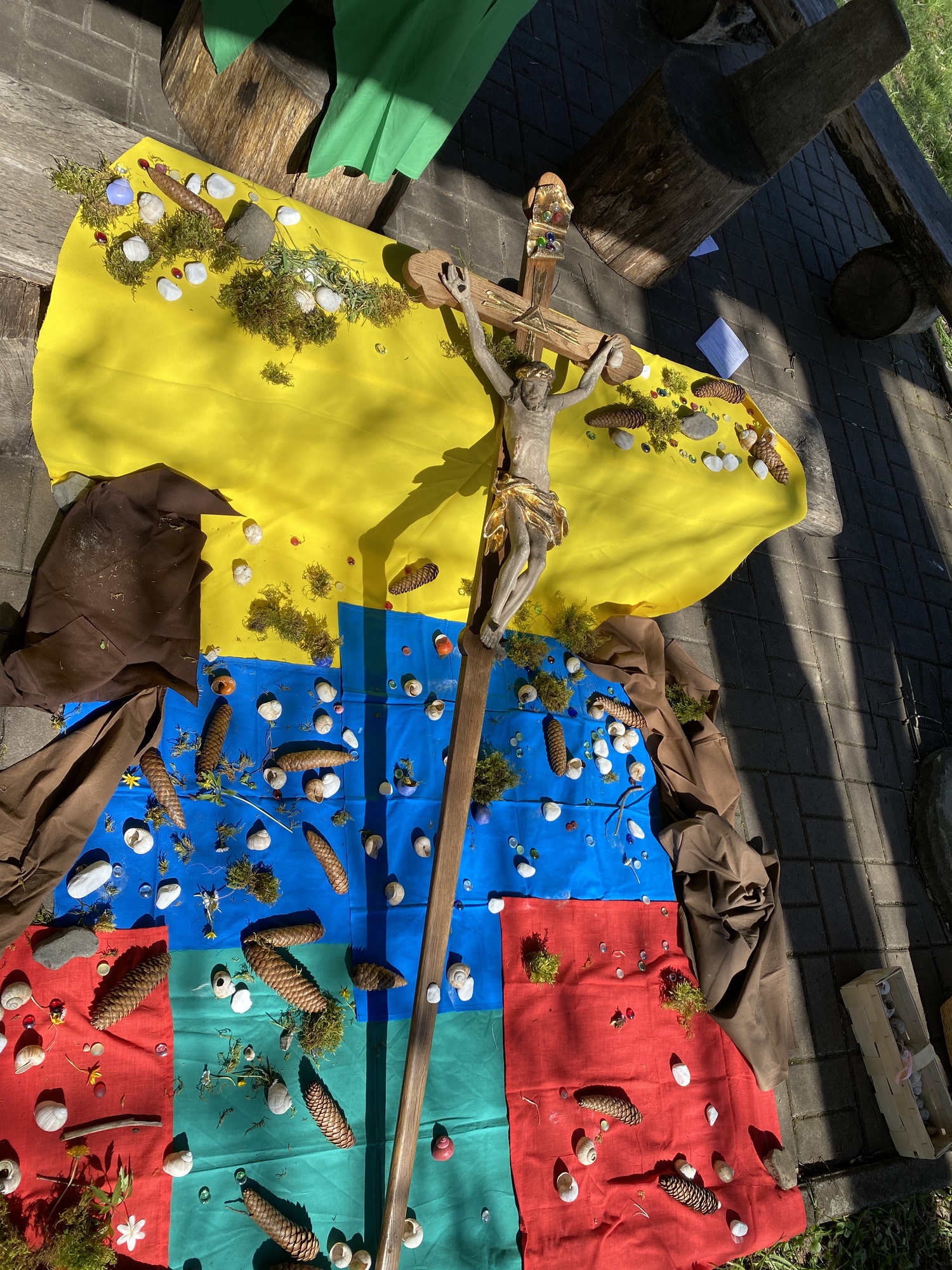 Alle Altersgruppen konnten auf diesem Weg die Verwandlung der traurigen, verzweifelten Jünger nach Jesu Tod am Kreuz hin zur fröhlichen Begegnung mit dem Auferstandenen und die Osterfreude neu begreifen. Die Kinder legten ihre Sorgen in Form von Steinen ab, bastelten aus Zweigen ein Kreuz und schmückten schließlich mit vielen Materialien aus der Natur das Kreuz als Hoffnungszeichen der Christen. Gemeinsame Fürbitten, Lieder und Gebete ließen alle Anwesenden ein Teil der Emmausgemeinde werden.