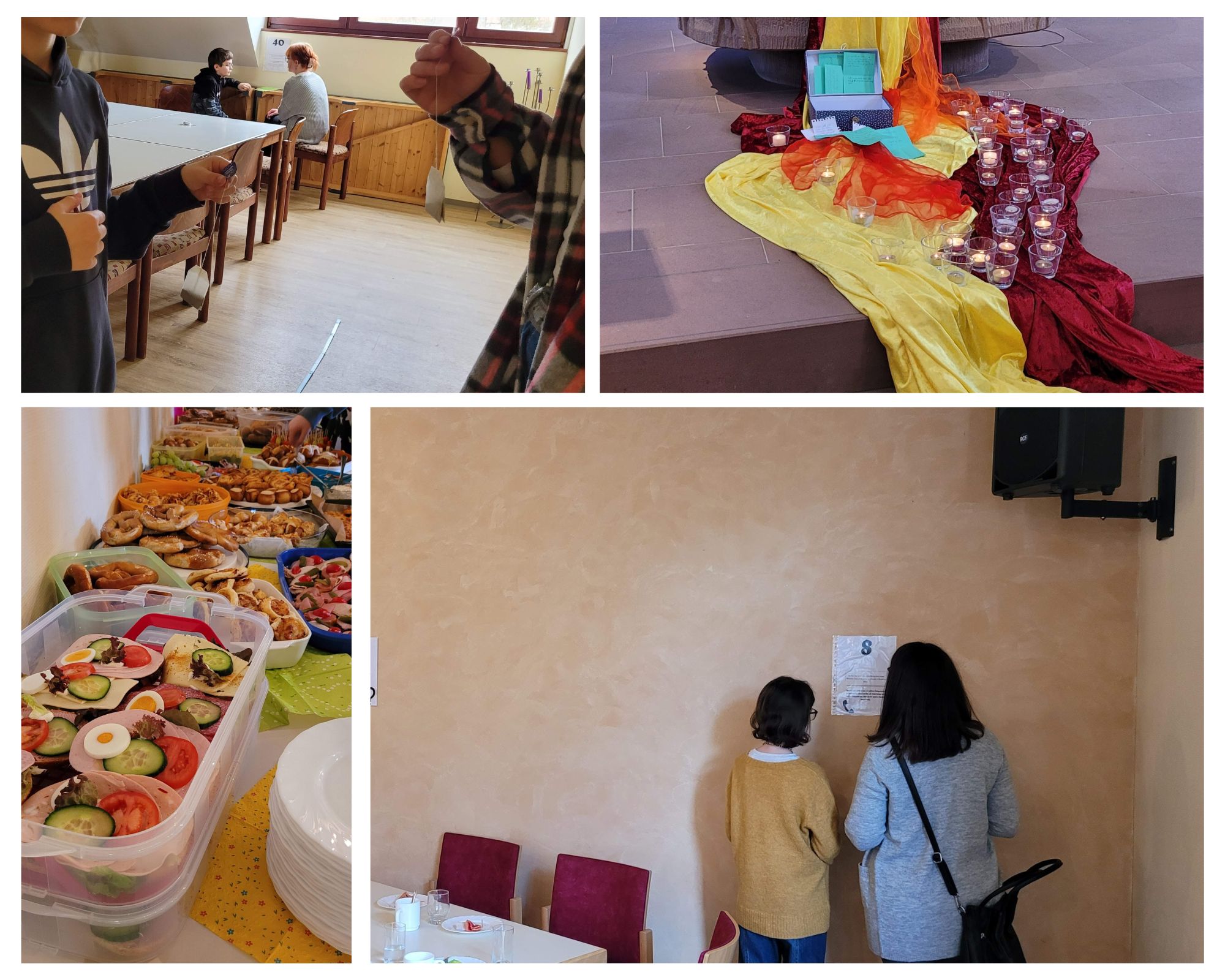 Gestärkt durch ein äußerst reichhaltiges Mitbringbuffet erkundeten sie gemeinsam 40 solcher Stationen rund um das KDH und in der nahegelegenen Pfarrkirche von Bischofsheim. Dabei gingen die Gespräche zwischen Firmlingen und Paten über Gott und die Welt weiter. Eindrücklich waren dann auch die Stationen, an denen sich die Firmlinge in die besonderen Elementen des Firmgottesdienstes einfühlen konnten. Sie durften sich etwa mit der bevorstehenden Salbung durch den Bischof vertraut machen, indem sie sich mit Creme ein Kreuz auf die Stirn zeichneten. Doch es ging auch lustig zu, wenn beispielsweise Firmlinge und Paten darum wetteiferten, wer mit dem Mund einen Teebeutel weiter werfen könnte. Gemeindereferentin Evi Warnke und Pastoralreferent Johannes Krebs hielten sich während der 90 Minuten dauernden Stationenzeit dezent im Hintergrund und ließen die 30 Firmlinge mit ihren Paten auf Entdeckungsreise gehen. Den Abschluss des Tages bildete ein Gottesdienst in der Kirche. Dort legten die Paten den Firmlingen die Hände auf die Schultern und machten ihnen deutlich: wir stehen hinter euch und stärken euch den Rücken. Die Firmlinge durften dabei auch einen ganz persönlichen Wunsch der Paten mitnehmen, den sie ihnen ins Ohr flüsterten. Wir wünschen allen einen wunderbaren Firmtag und Gottes reichen Segen für ihren Lebensweg.
