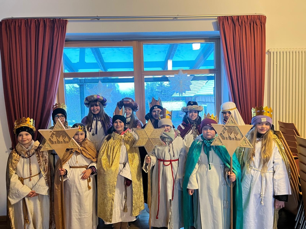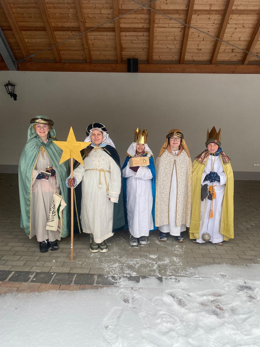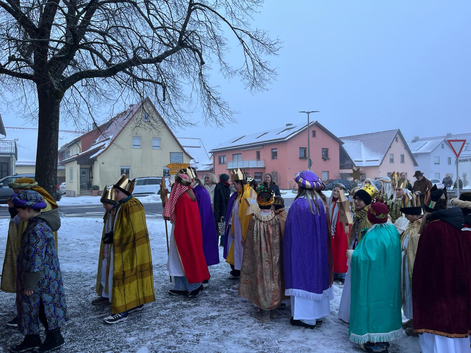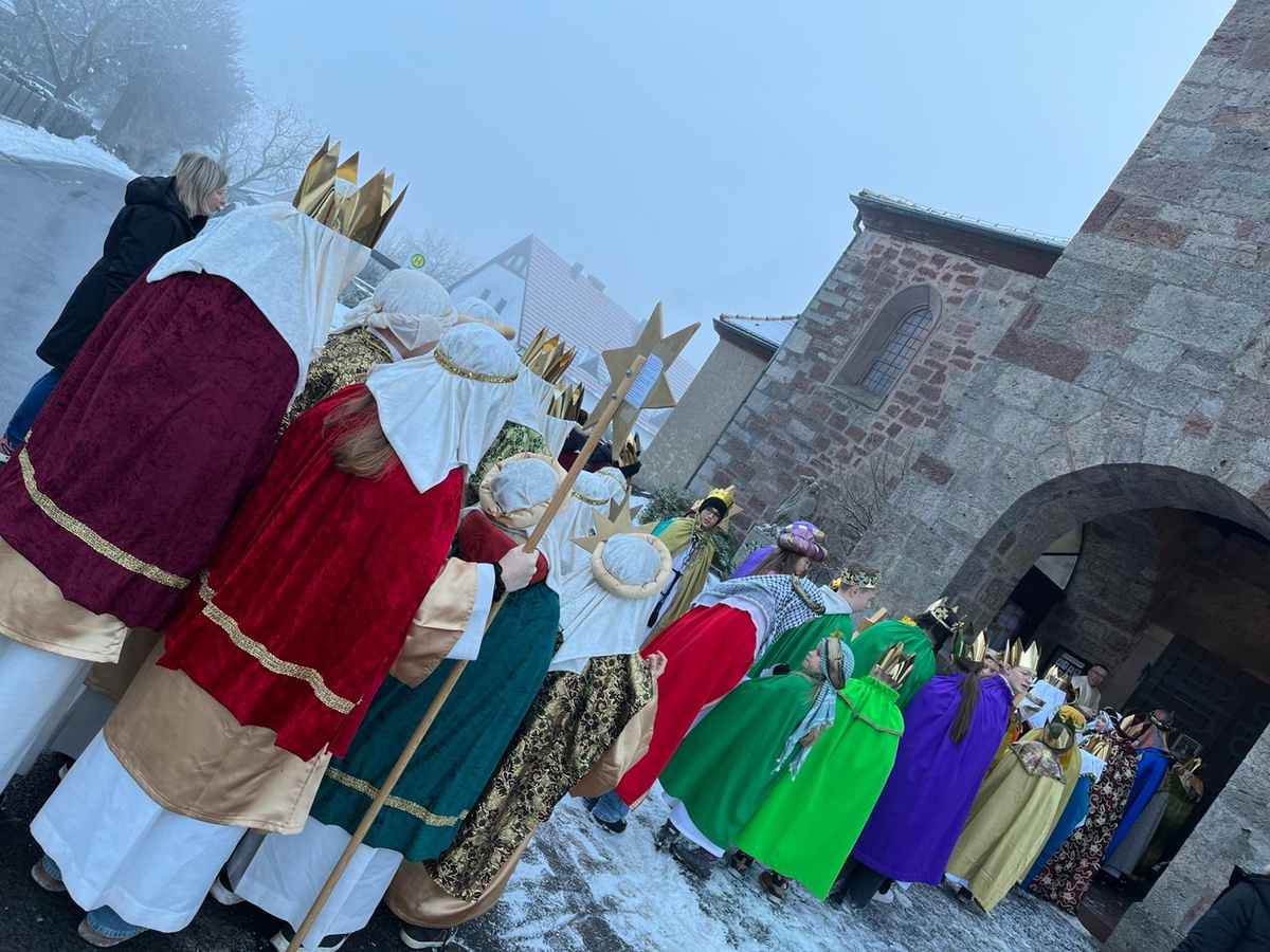 In ihren prächtigen Gewändern und mit dem leuchtenden Stern voran zogen sie von Haus zu Haus, schrieben den Segen „C+M+B“ an die Türen und sammelten Spenden für Kinder in Not weltweit. Trotz winterlicher Temperaturen ließen sich die Sternsinger nicht beirren und brachten die Weihnachtsbotschaft direkt zu den Menschen in unserem Pastoralen Raum.