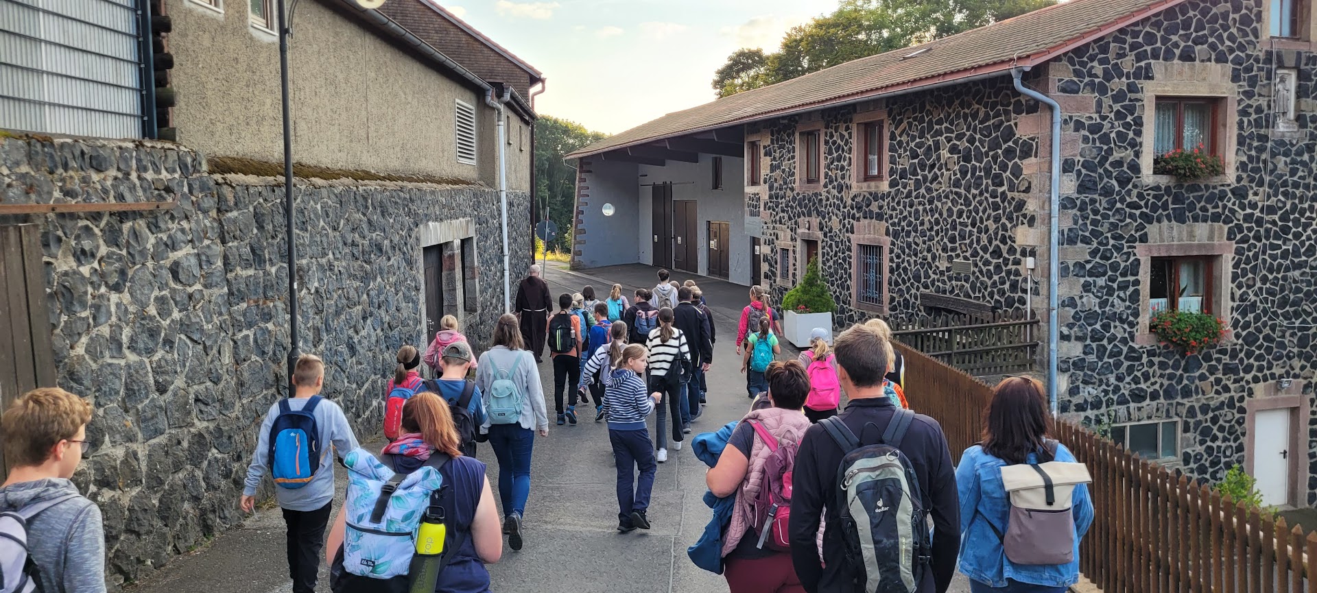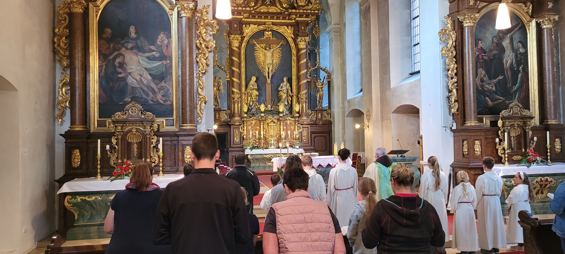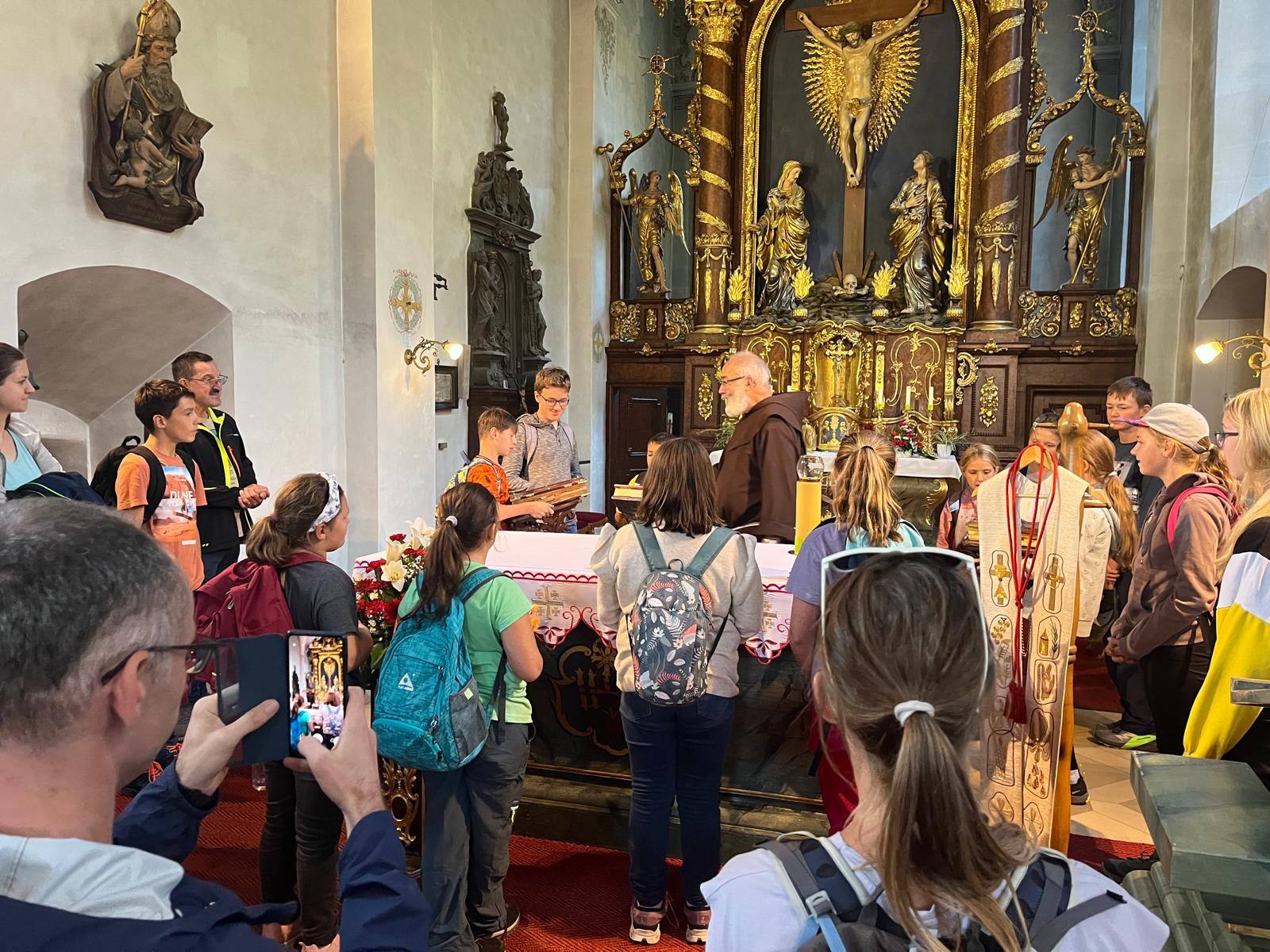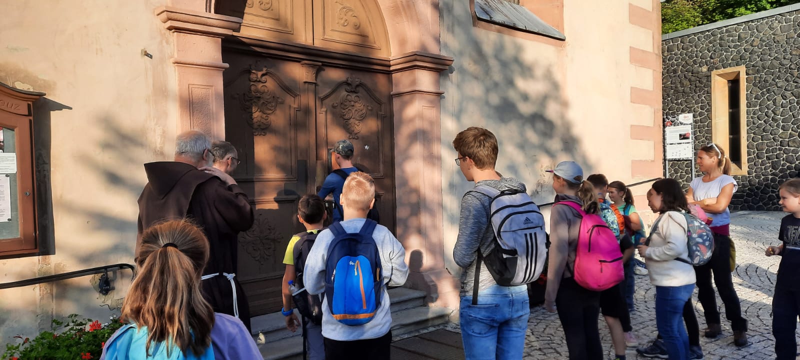 Bei bestem Spätsommerwetter waren 20 Ministranten aus dem Pastoralen Raum Am Kreuzberg mit ihren Verantwortlichen zu einer Ministrantenwanderung zum Kloster Kreuzberg losgezogen. Am Wanderparkplatz oberhalb von Sandberg brach die erste Gruppe aus den Walddörfern miteinander auf. Die Wandersleute wurde dann verstärkt durch die Minis aus den Pfarreiengemeinschaften Am Kreuzberg und Immanuel-Hohe Rhön. Als stattliche Truppe wurden sie dann am Kloster von Bruder Korbinian empfangen. In der Klosterkirche feierten sie miteinander eine Eucharistiefeier, bei der viele Minis den Dienst am Altar ausübten. Hier tauchte endlich auch die Schatztruhe auf, über die man sich auf dem Weg schon so viele Gedanken gemacht hatte. Im Inneren waren neben Schokotalern dann auch wahre Schätze: Wortkarten mit den Begriffen Frieden, Liebe, Freude, Hoffnung und Glaube verdeutlichten die wertvollsten Erfahrungen, die wir im Leben machen können. Und es wurde deutlich, dass die Ministranten zu den größten Schätzen ihrer Gemeinden zählen. Nach dem Gottesdienst führte Bruder Korbinian die Gruppe an verschiedene Orte des Klosters, die man sonst als Wallfahrer oder Besucher nicht unbedingt zu sehen bekommt. Wer sonst erhält einen Einblick hinter den Hochaltar, darf die alte Kanzel betreten oder einen „Geheimgang“ entdecken? Mit vielen interessanten und kurzweiligen Eindrücken und einem knurrenden Magen gingen dann alle miteinander in die Klostergastronomie und ließen es sich dort gut gehen. Beim Einbrechen der Dunkelheit ging es dann wieder bergab zu den Ausgangspunkten der Wanderung. Den krönenden Abschluss des Tages bildeten wunderschöne Sonnenuntergangsmomente und die unvergleichliche Stimmung einer Nachtwanderung bei noch lauen Temperaturen.