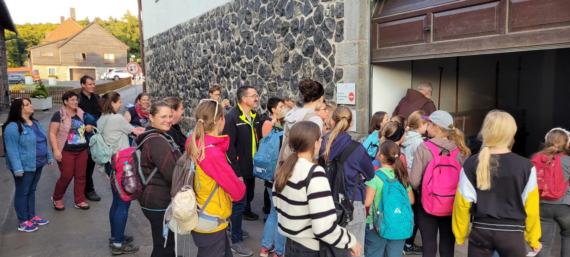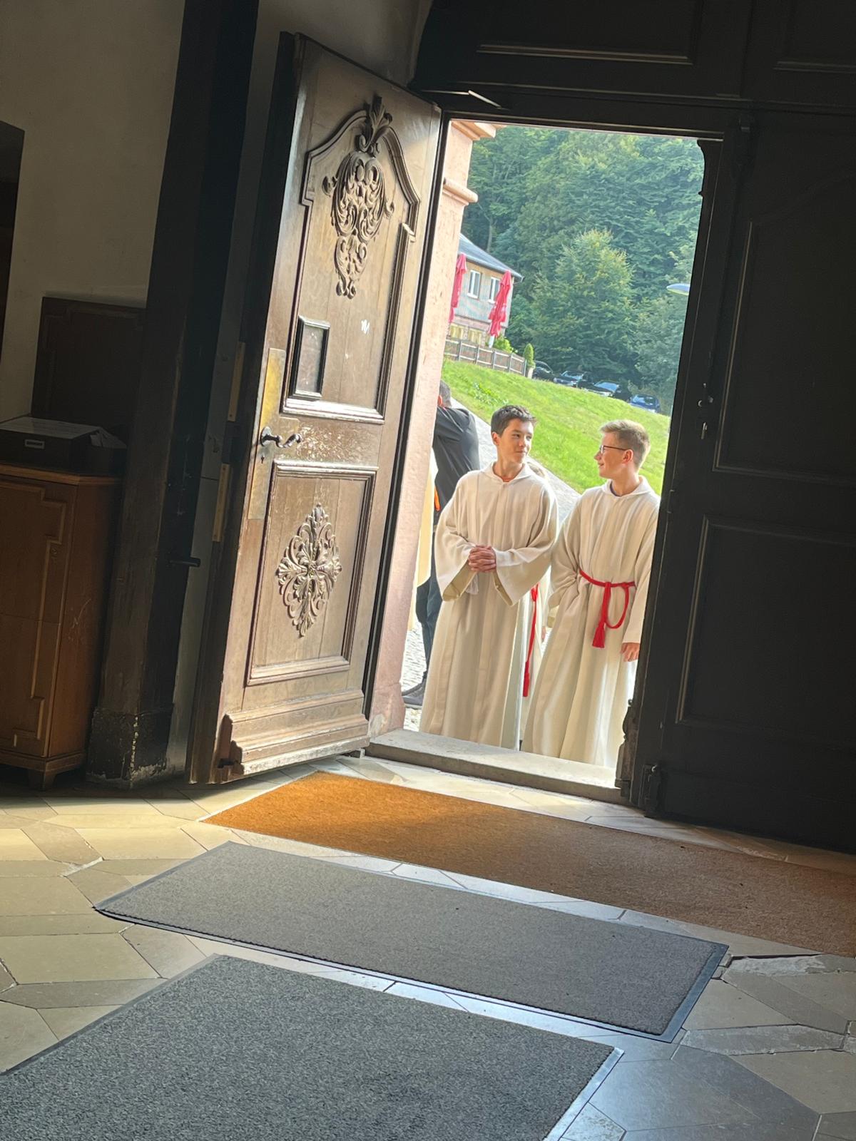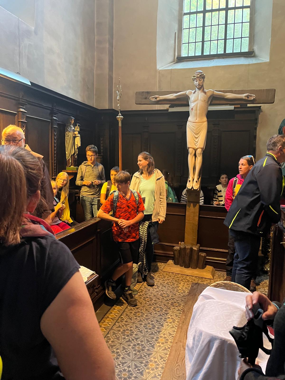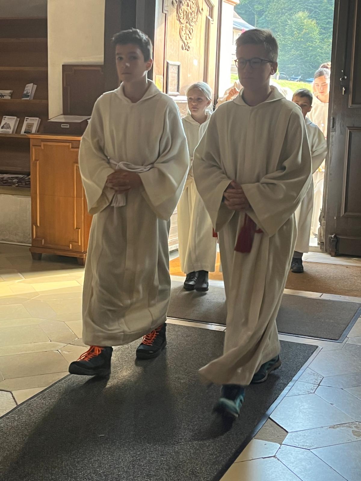 Bei bestem Spätsommerwetter waren 20 Ministranten aus dem Pastoralen Raum Am Kreuzberg mit ihren Verantwortlichen zu einer Ministrantenwanderung zum Kloster Kreuzberg losgezogen. Am Wanderparkplatz oberhalb von Sandberg brach die erste Gruppe aus den Walddörfern miteinander auf. Die Wandersleute wurde dann verstärkt durch die Minis aus den Pfarreiengemeinschaften Am Kreuzberg und Immanuel-Hohe Rhön. Als stattliche Truppe wurden sie dann am Kloster von Bruder Korbinian empfangen. In der Klosterkirche feierten sie miteinander eine Eucharistiefeier, bei der viele Minis den Dienst am Altar ausübten. Hier tauchte endlich auch die Schatztruhe auf, über die man sich auf dem Weg schon so viele Gedanken gemacht hatte. Im Inneren waren neben Schokotalern dann auch wahre Schätze: Wortkarten mit den Begriffen Frieden, Liebe, Freude, Hoffnung und Glaube verdeutlichten die wertvollsten Erfahrungen, die wir im Leben machen können. Und es wurde deutlich, dass die Ministranten zu den größten Schätzen ihrer Gemeinden zählen. Nach dem Gottesdienst führte Bruder Korbinian die Gruppe an verschiedene Orte des Klosters, die man sonst als Wallfahrer oder Besucher nicht unbedingt zu sehen bekommt. Wer sonst erhält einen Einblick hinter den Hochaltar, darf die alte Kanzel betreten oder einen „Geheimgang“ entdecken? Mit vielen interessanten und kurzweiligen Eindrücken und einem knurrenden Magen gingen dann alle miteinander in die Klostergastronomie und ließen es sich dort gut gehen. Beim Einbrechen der Dunkelheit ging es dann wieder bergab zu den Ausgangspunkten der Wanderung. Den krönenden Abschluss des Tages bildeten wunderschöne Sonnenuntergangsmomente und die unvergleichliche Stimmung einer Nachtwanderung bei noch lauen Temperaturen.