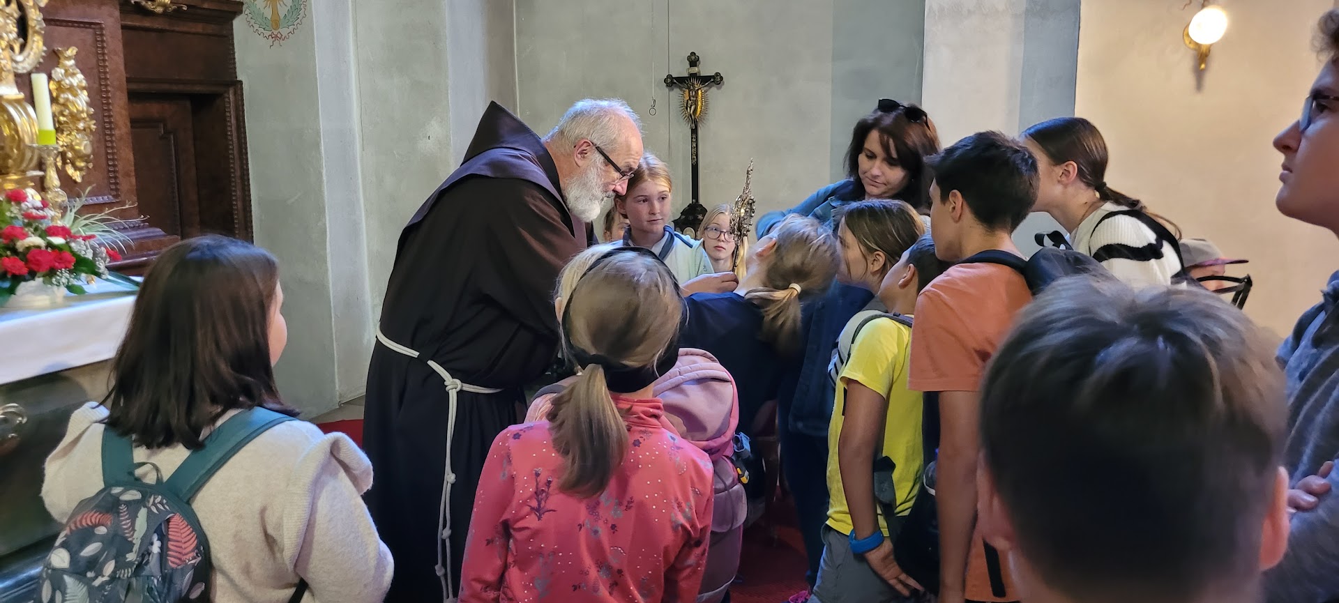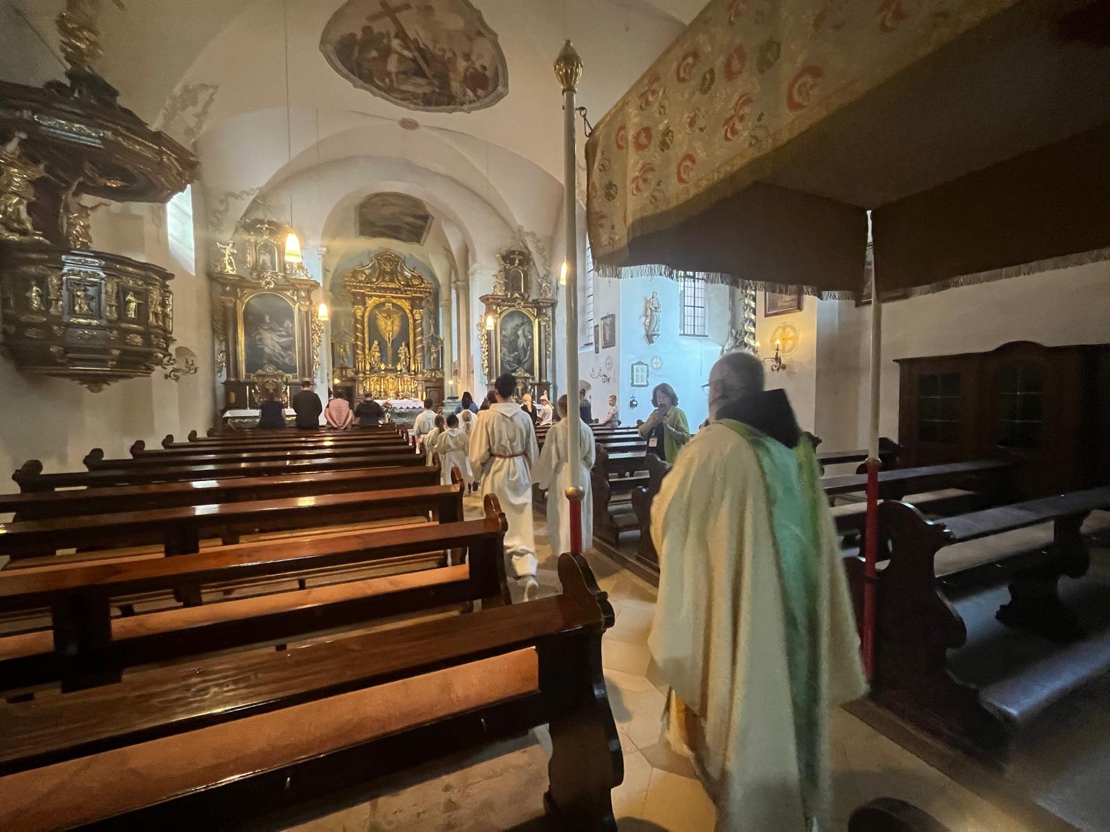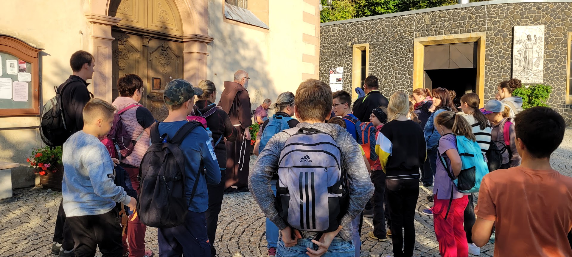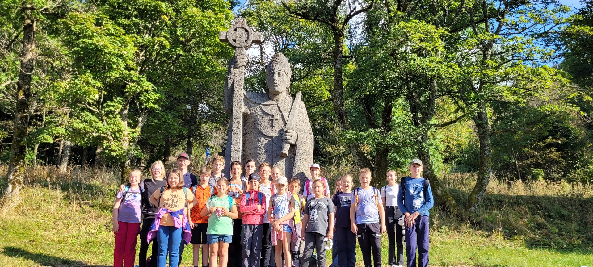 Bei bestem Spätsommerwetter waren 20 Ministranten aus dem Pastoralen Raum Am Kreuzberg mit ihren Verantwortlichen zu einer Ministrantenwanderung zum Kloster Kreuzberg losgezogen. Am Wanderparkplatz oberhalb von Sandberg brach die erste Gruppe aus den Walddörfern miteinander auf. Die Wandersleute wurde dann verstärkt durch die Minis aus den Pfarreiengemeinschaften Am Kreuzberg und Immanuel-Hohe Rhön. Als stattliche Truppe wurden sie dann am Kloster von Bruder Korbinian empfangen. In der Klosterkirche feierten sie miteinander eine Eucharistiefeier, bei der viele Minis den Dienst am Altar ausübten. Hier tauchte endlich auch die Schatztruhe auf, über die man sich auf dem Weg schon so viele Gedanken gemacht hatte. Im Inneren waren neben Schokotalern dann auch wahre Schätze: Wortkarten mit den Begriffen Frieden, Liebe, Freude, Hoffnung und Glaube verdeutlichten die wertvollsten Erfahrungen, die wir im Leben machen können. Und es wurde deutlich, dass die Ministranten zu den größten Schätzen ihrer Gemeinden zählen. Nach dem Gottesdienst führte Bruder Korbinian die Gruppe an verschiedene Orte des Klosters, die man sonst als Wallfahrer oder Besucher nicht unbedingt zu sehen bekommt. Wer sonst erhält einen Einblick hinter den Hochaltar, darf die alte Kanzel betreten oder einen „Geheimgang“ entdecken? Mit vielen interessanten und kurzweiligen Eindrücken und einem knurrenden Magen gingen dann alle miteinander in die Klostergastronomie und ließen es sich dort gut gehen. Beim Einbrechen der Dunkelheit ging es dann wieder bergab zu den Ausgangspunkten der Wanderung. Den krönenden Abschluss des Tages bildeten wunderschöne Sonnenuntergangsmomente und die unvergleichliche Stimmung einer Nachtwanderung bei noch lauen Temperaturen.