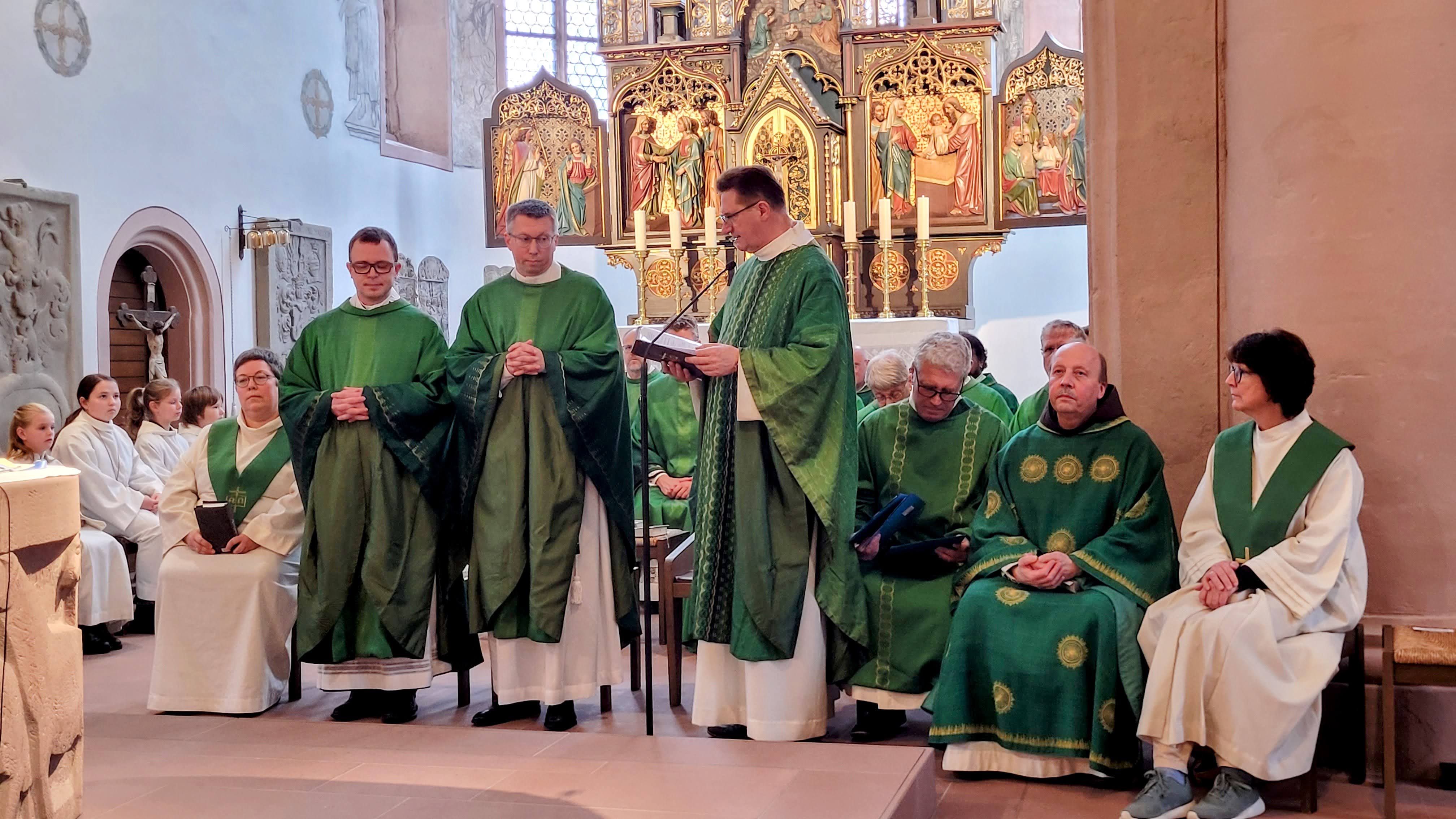 Bischofsheim - In der voll besetzten Stadtpfarrkirche St. Georg feierte der Pastorale Raum „Am Kreuzberg“ die Einführung der beiden neuen Pfarrer Thomas Elbert und Bertram Ziegler. Sie treten die Nachfolge von Stadtpfarrer Manfred Endres (Bischofsheim) und Pfarrer Hubert Grütz (Sandberg) an, die vor einiger Zeit in den Ruhestand verabschiedet wurden. Die Atmosphäre war geprägt von Herzlichkeit, Musik und viel Beteiligung aus der Gemeinde.