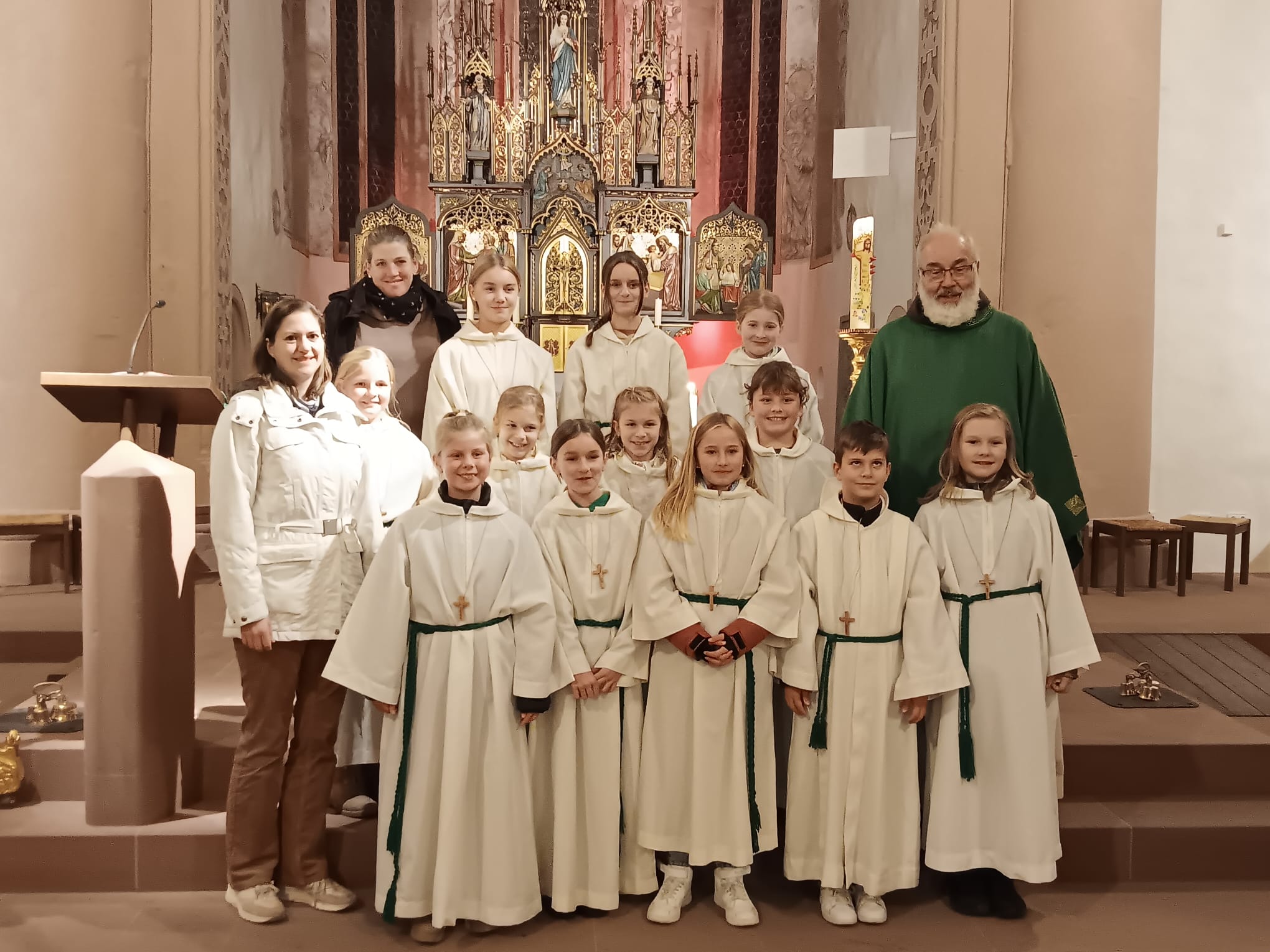 Zu Beginn gaben die Ministranten ihr Versprechen ab, dass sie zukünftig diesen Dienst zuverlässig und sorgfältig verrichten wollen. Namentlich stellten sich alle der Gemeinde vor. Danach zeigte Bruder Korbinian wichtige Gegenstände des Gottesdienstes und erläuterte deren Bedeutung. Allem voran das Kreuz, die Leuchter, Messkännchen mit Wasser und Wein, Opferkörbchen, Altarschellen, Weihrauch und Schiffchen sowie das Weihwasser. Den Ministranten wurde jeweils symbolisch ein Gegenstand übergeben. Als besondere Überraschung und als Dank für ihren Dienst in der Gemeinde gab es für alle, sowohl für die neuen als auch für die bisherigen Ministranten, eigene Holzkreuze, die mit den Namen der Minis personalisiert sind. Nach der Segnung bekamen alle anwesenden Minis ihr eigenes Kreuz umgehängt. Zusätzlich erhielten die neuen Ministranten noch eine „Mini-Urkunde“. Im Laufe des Gottesdienstes übernahmen die neuen Ministranten auch die Fürbitten. Sie beteten unter anderem für Freude und Ausdauer im Dienst und für ihre Eltern, dass deren Bereitschaft gestärkt wird, die Kinder im Ministrantendienst zu begleiten und zu unterstützen. Zum Ende des Gottesdienstes bedankte sich Bruder Korbinian noch einmal bei den Ministranten für ihre Bereitschaft, am Tisch des Herrn zu dienen. Einen weiteren Dank sprach er an die beiden Ministrantenbetreuerinnen aus für ihr Engagement, sei es die Organisation von Proben oder auch die Planung von Ausflügen und Aktionen. Mit den neuen Minis vervollständigt sich die Gemeinschaft auf insgesamt stolze 21 Ministranten und Ministrantinnen in der Kirchengemeinde in Bischofsheim.