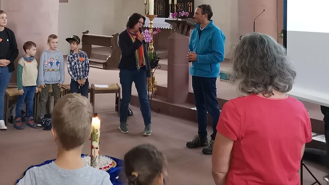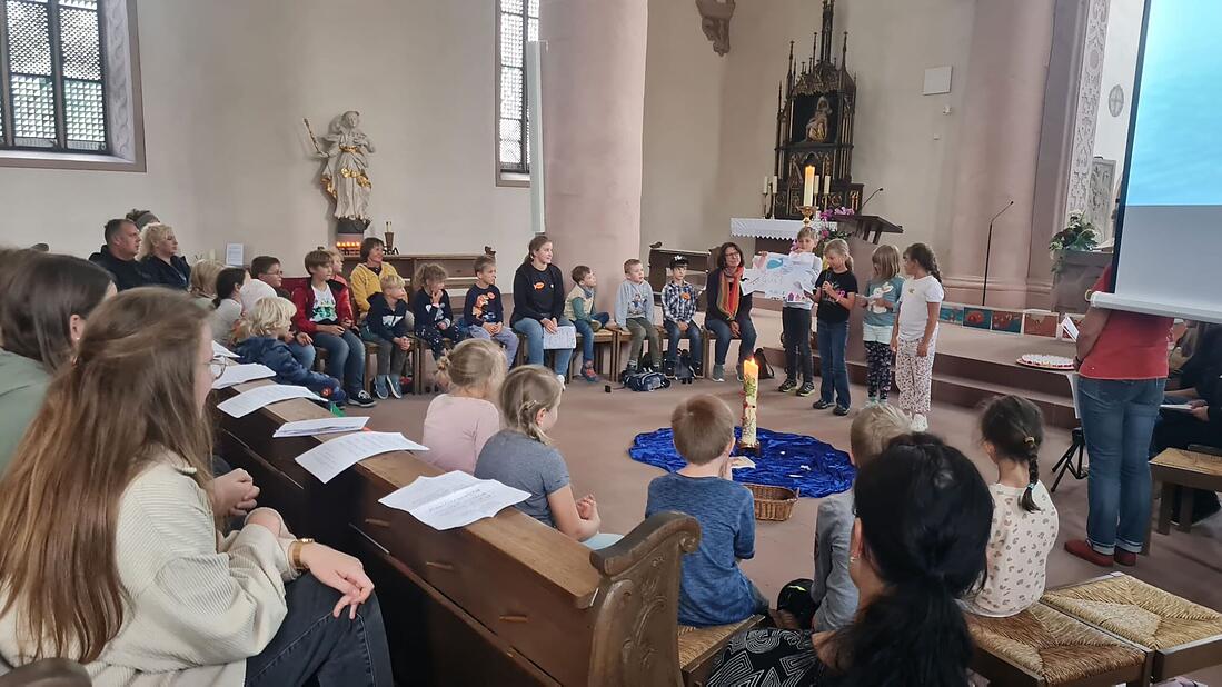 Mit Spielen, Liedern, Gestalten, Gesprächen, und nicht zuletzt der Geschichte aus der Bibel von Jona und dem Wal, wurden die Kinder an das Thema herangeführt. Es gab auch leckeres Essen, das von Müttern und Ehrenamtlichen liebevoll gereicht wurde. Danach tollte die fröhliche Gemeinschaft im Garten. Der Tag endete mit einer gemeinsamen Feier in der Kirche St. Georg Bischofsheim. Hierzu waren auch die Eltern und die Mitglieder der Pfarrgemeinden eingeladen. Die Ideen der vergangenen Stunden haben die Kinder auf Plakate zusammengetragen und stellten sie in der großen Runde vor: