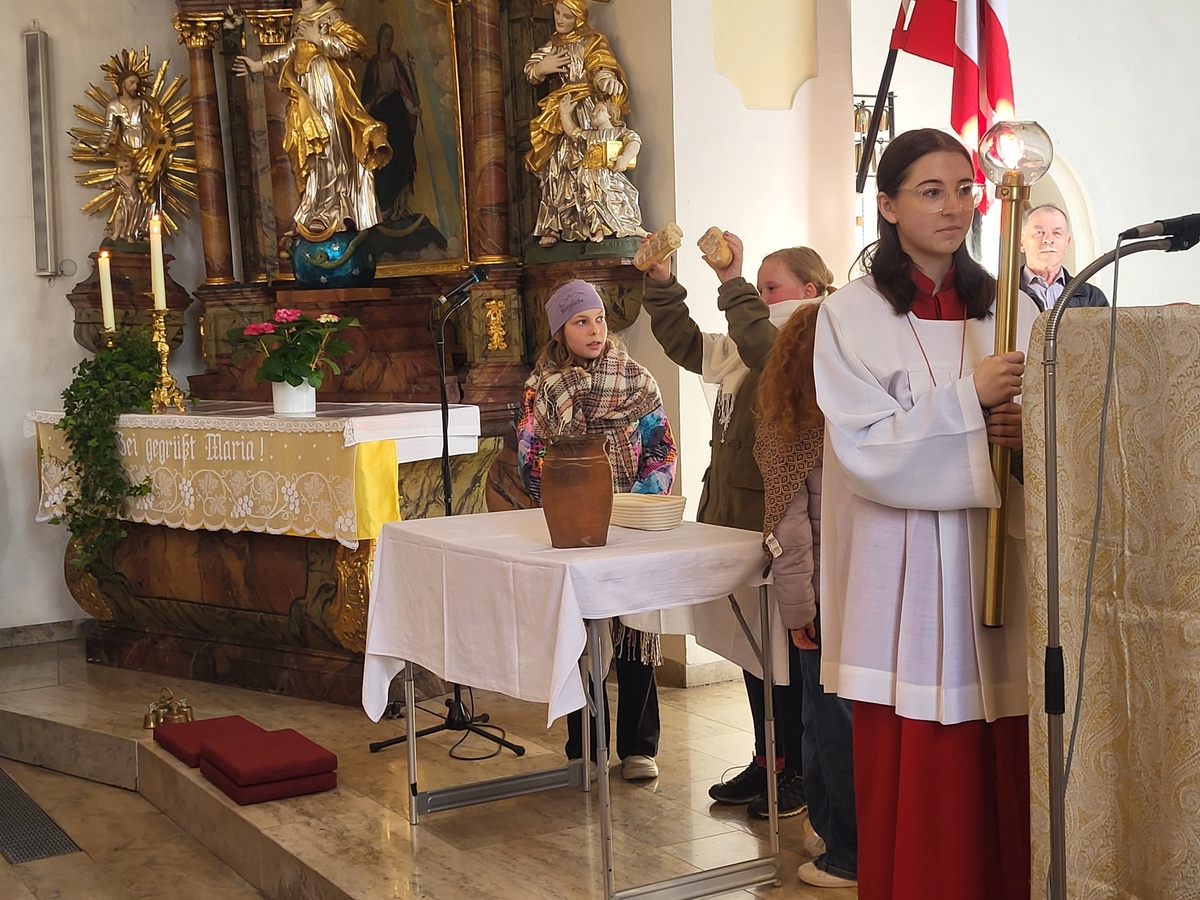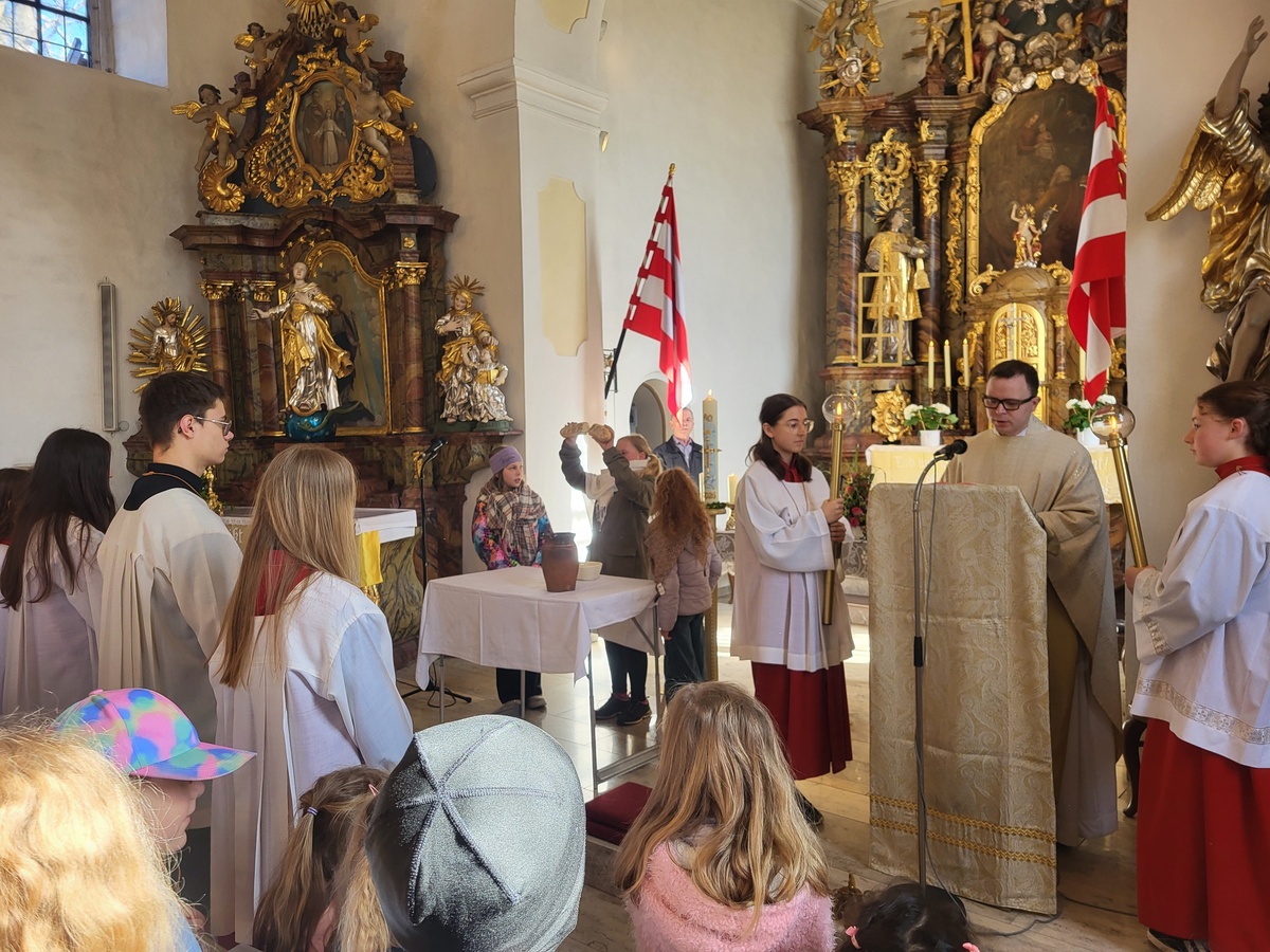 Gut gestärkt führte der Weg weiter in die Kirche. Dort eröffnete eine große Schar an Kindern gemeinsam mit den Ministranten und Pfarrer Bertram Ziegler den Gottesdienst. Für die musikalische Gestaltung sorgte die Gruppe „feingestimmt“, die die Feier stimmungsvoll begleitete.