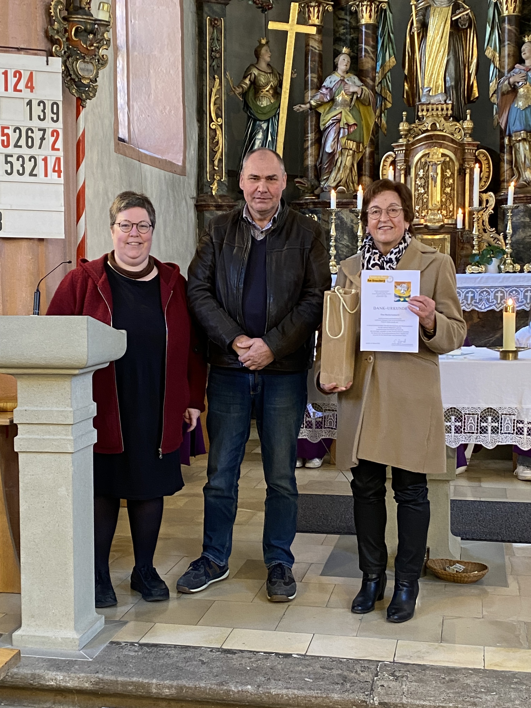 Verabschiedet wurde Marita Lenhardt, die zwölf Jahre lang als Kirchenrechnerin die Zahlen und Finanzen der Kirchengemeinde im Blick hatte. Gemeindereferentin Zipprich und Kirchenpfleger Vorndran dankten ihr für ihren Dienst und überreichten ihr eine Urkunde, einen Edelstein sowie ein Geschenk.