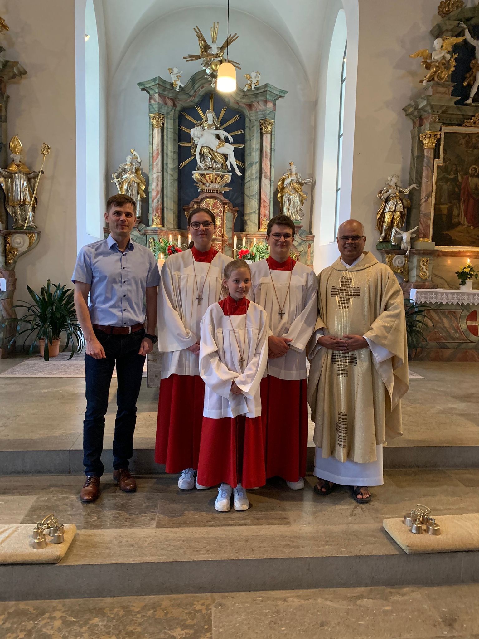 Im Gottesdienst am 14. August 2023 wurden in der Pfarrei Petri Thronfeier in Weisbach die Ministranten Rebecca Sitzmann und Christoph Klein von Pfarrer Gabriel und dem Ministrantenbeauftragten Bastian Benkert nach sieben Jahren Dienst am Altar verabschiedet. Als Dankeschön für ihre lange Mithilfe überreichte er ein kleines Geschenk. Greta Wappes wurde in die Ministrantenschar aufgenommen. Ihr viel Freude beim Ministrieren.