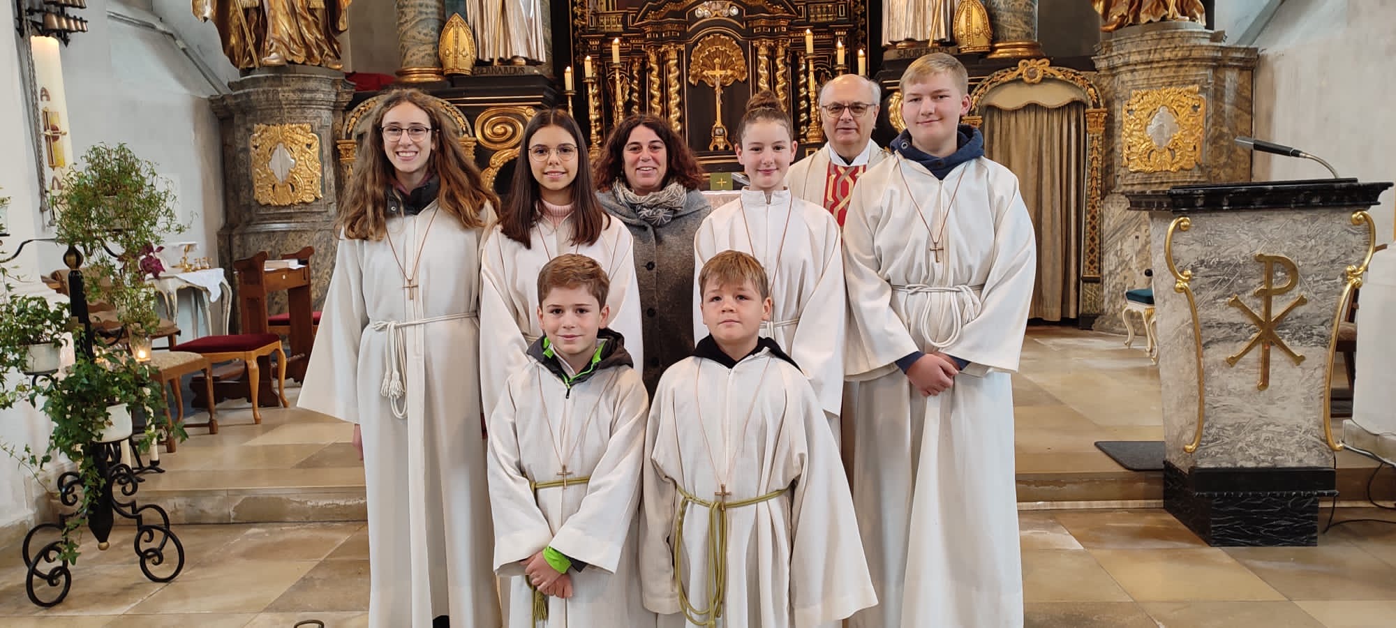 Pfarrer Grütz und Ministrantenbeauftrage Frau Katja Zernentsch freuten sich, dass an diesem Tag mit Elias Zernentsch und Felix Wolf zwei neue Ministranten zum Dienst am Altar eingeführt und von den Ministrantinnen in die Minigruppe aufgenommen wurden.
