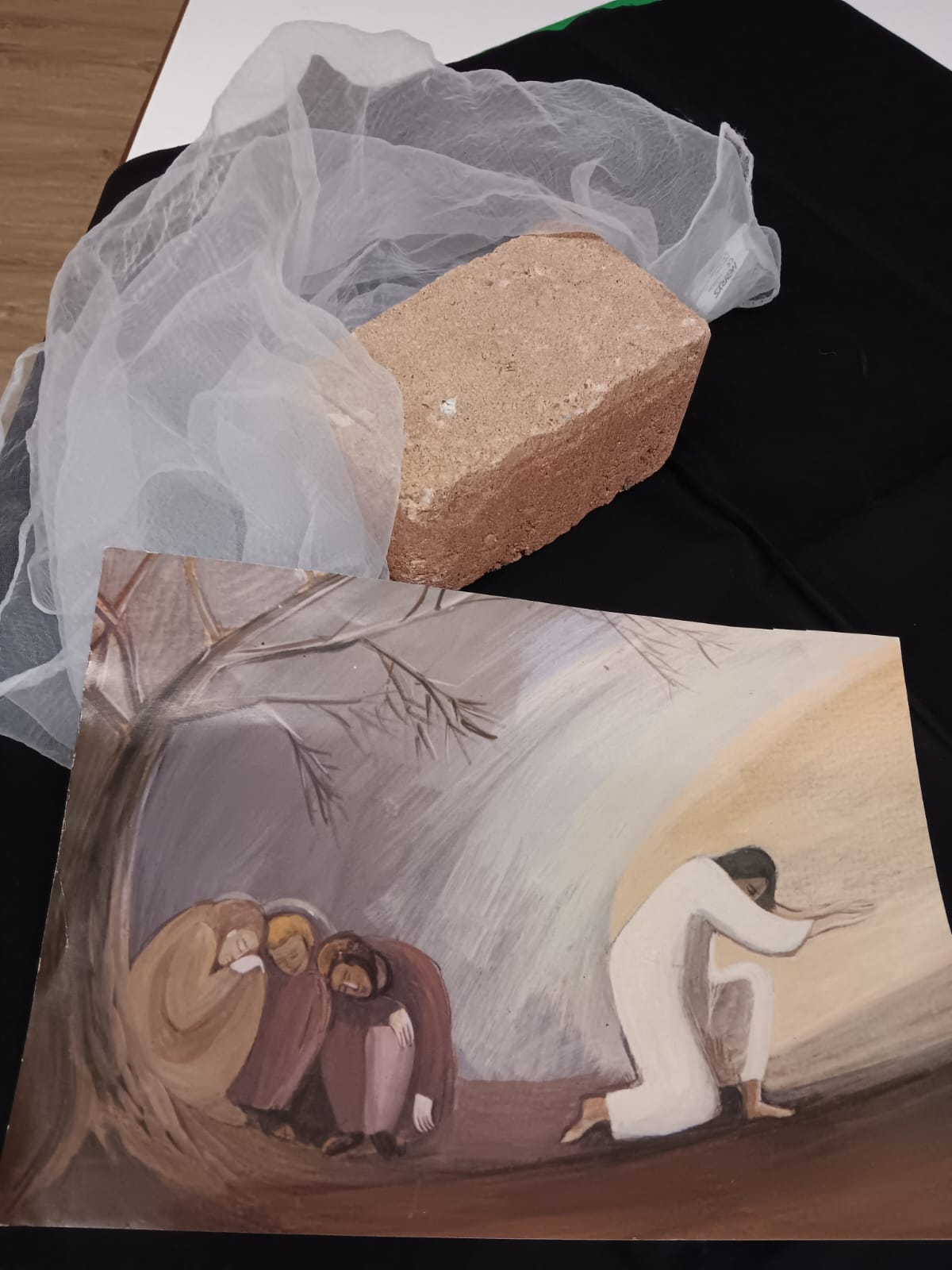 Nach dem gemeinsamen „Mahl“ gingen wir mit Jesus an den Ölberg. Ein großer Stein symbolisierte seine Angst. Aus der Schrift erfuhren alle, dass Gott Jesus nicht im Stich lässt. Er schickt ihm einen „Durchhalte-Engel“.