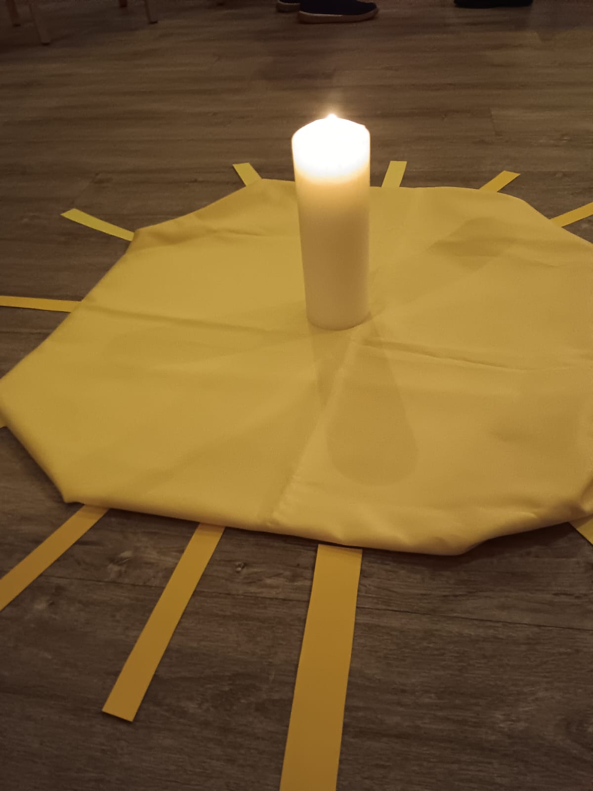 Natürlich endete der Weg durch die Heilige Woche mit dem Ausblick auf das Osterfest. Die Ostersonne erstrahlte in der Mitte. Jeder durfte einen gelben Strahl dazulegen und von seinen kleinen und großen „Auferstehungs-Freuden“ im Alltag erzählen.