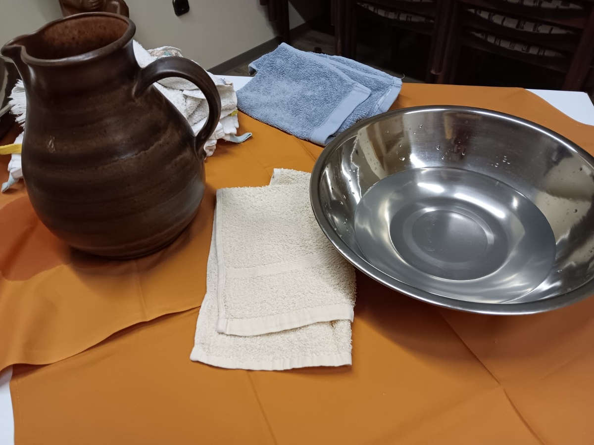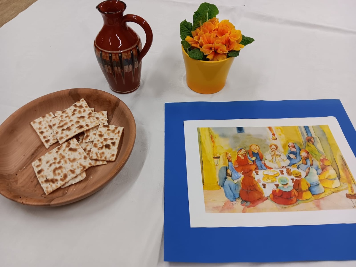 Danach ging es ins „Obergemach“ in den ersten Stock des KDH. Der zweite wichtige Tag der Karwoche stand nun im Mittelpunkt: der Gründonnerstag. Die Erwachsenen waren eingeladen, sich gegenseitig die Hände zu waschen, um dem Liebesdienst von Jesus nachzufühlen. Im Raum dann hörten alle die wichtigen Worte Jesu beim Letzten Abendmahl und teilten dann Brot und Traubensaft.