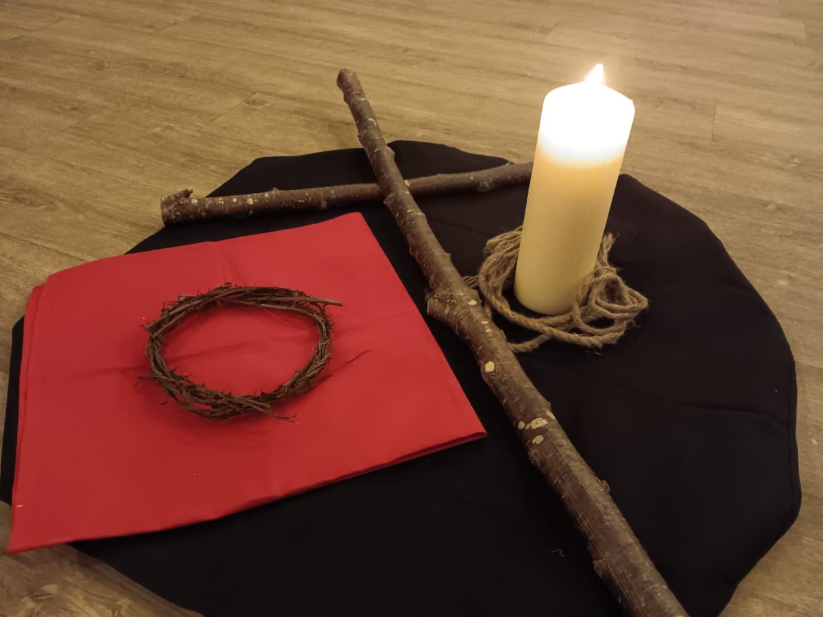 Mit dem Ruf „Bleib bei uns auf unsrem Weg“ gingen alle in den großen Saal. In der Mitte lag schon ein schwarzes Tuch, darauf nun die Jesus-Kerze mit Fessel gestellt wurde. Mit Blick auf die Dornenkrone fragten wir uns, wann wir schon einmal lächerlich gemacht wurden. Auf verschiedenen Bildern erkannten die Kinder, dass Jesus nicht alleine auf seinem Kreuzweg war.