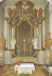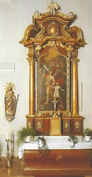 Dieses waren schwere und sehr gefährliche Arbeiten, doch ist hiebey niemand verunglücket. Den 9. September fing Sebastian Büttner an, dieses Altar unterstutzt von Frönern aufzurichten, welche Arbeit währte bis den 2. October, weilen dieses hohe Altar 1 1/2 Schuh (45 cm) mußten abgenommen werden, und auch manche Stücke die durch Fuhren gelitten, eine Reparatur bedurften, so machte dieses Aufrichten vielen Aufenthalt. Doch freute sich nun alles, wieder ein Altar in der Kirche zu sehen, auf welchem ich nun anfing Messe zu lesen."