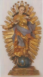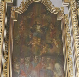 Das Mittelbild steht im Hintergrund in ca. 1 Meter Abstand. Es stellt die Himmelfahrt Mariens dar und gleicht dem Hochaltarbild in der Zisterzienserabtei Bronnbach bei Wertheim, das im Jahre 1670 von dem im fränkischen Raum außerordentlich geschätzten Meister Oswald Onghers gemalt wurde.